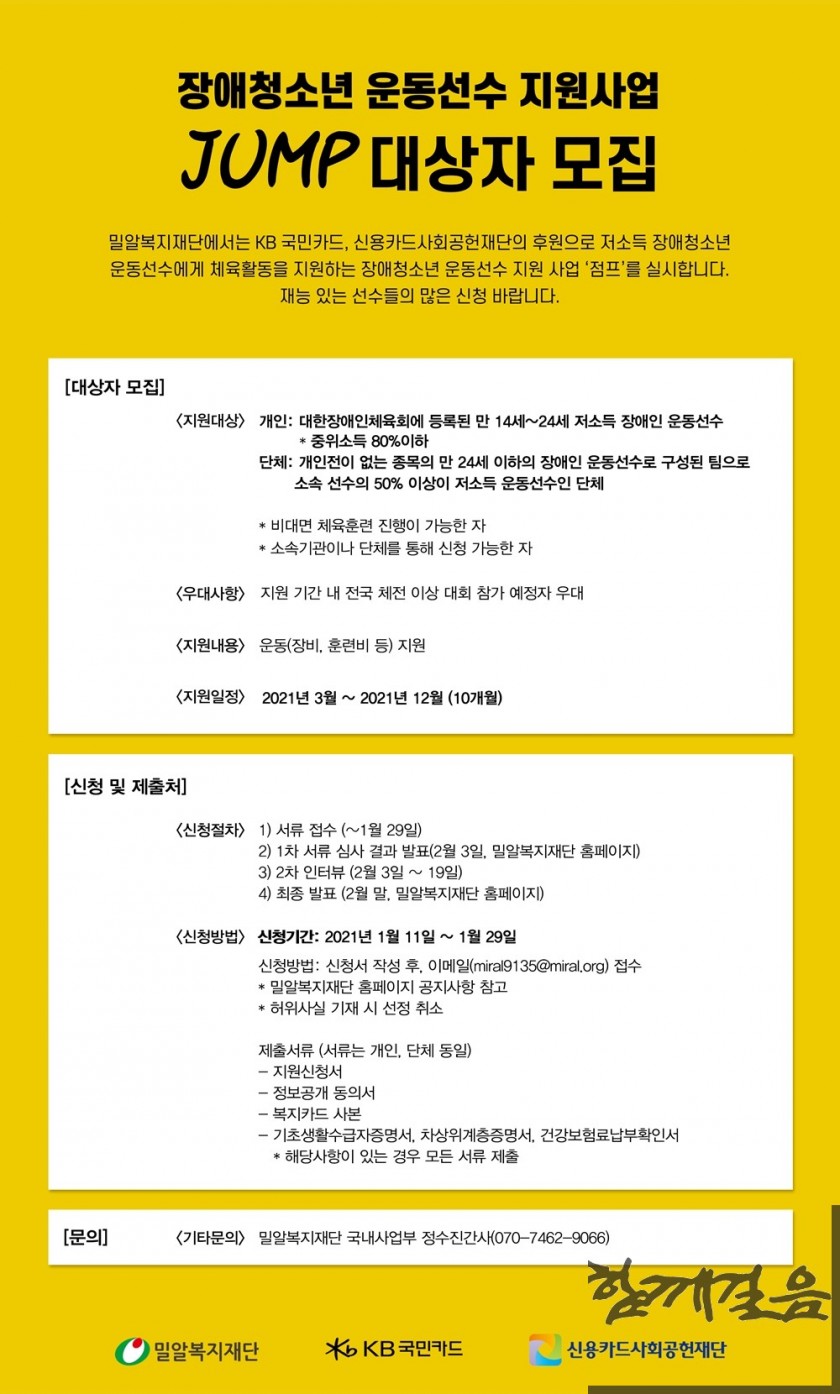 밀알복지재단(이사장 홍정길)이 저소득 장애청소년 운동선수 지원사업 ‘점프’ 대상자를 모집한다.