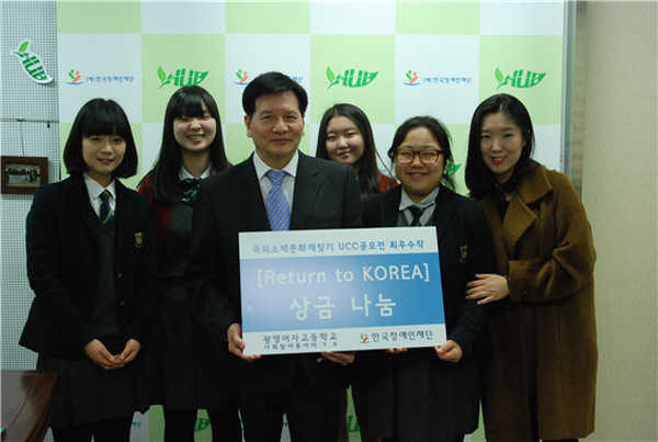 | ▲ 이채필 한국장애인재단 이사장(가운데 왼쪽)과 광영여자고등학교 사회참여 동아리 학생들, 김인영 담당교사(오른쪽 끝)가 상금 나눔을 하고 있다. | ||