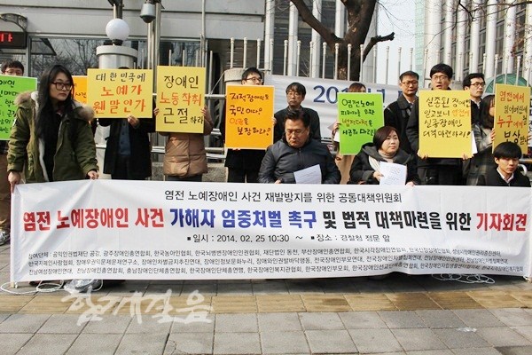 염전노예 장애인사건 재발방지를 위한 공동대책위원회(이하 공대위)는 25일 오전 10시30분 서울 서대문구 경찰청 정문 앞에서 기자회견을 열고 “염전노예 사건은 단순 임금 체불의 문제를 넘어선 심각한 인권유린 사건”이라고 밝혔다.