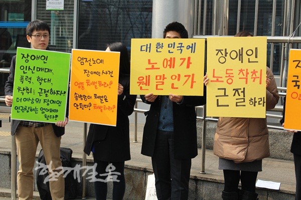 한편, 채아무개(48, 지적장애) 씨와 김아무개(40, 시각장애) 씨는 지난 수년간 전남 신안군의 한 염전에 감금당한 채 무임금 노동을 강요당했다. 둘은 세 번의 탈출시도 끝에 지난달 말 구로경찰서에 의해 극적으로 구조됐다.