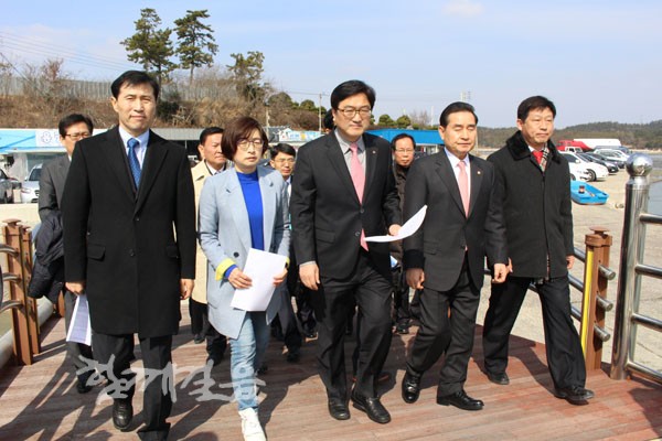 | ▲ 민주당 을(乙)지로위원회가 신안군에서 벌어진 염전 노예 사건의 경위 파악과 재발방지대책을 마련하기 위해 신안군 신의면을 방문했다. (사진 맨 앞줄 왼쪽부터)민주당 이학영 의원, 은수미 의원, 우원식 최고위원(을지로위원회 위원장), 이윤석 전남도당위원장이 사건현장인 '천사의 섬'이라 불리는 신의면으로 들어가기 위해 배에 오르고 있다. | ||