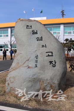 | ▲ 신의도(신의면) 주민센터 앞에는 커다란 돌에 '천일염의 고장 신의도'라고 새겨져 있다. 우리나라 천일염은 전라남도에서 40%를 생산하고 있으며, 이 40% 중 30%가 신의면의 염전에서 생산하고 있다. | ||