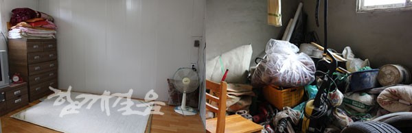 | ▲ 염전 종사자의 거처를 방문했다. 방은 깔끔한 듯 보였으나 바로 앞에는 온갖 고물들과 소금을 담은 부대들이 쌓여 있었고, 주거 공간으로 볼 수 없는 창고 수준이었다. (왼쪽)방 내부 (오른쪽)방 외부 | ||