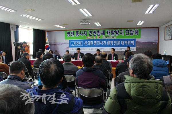 | ▲ 장애인단체와 인권단체는 현장실태 조사에서 종사자와의 대화가 아닌 업주와의 간담회가 마련된 것에 대해 문제제기를 하며 간담회에 참석하지 않았다. 실제로 간담회 제목과는 달리, 염전주들의 입장표명이 주요 내용이었다. | ||