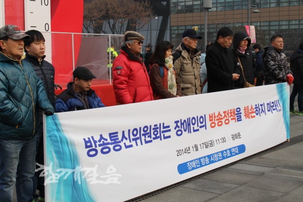 | ▲ 장애인 방송 시청권 수호를 위한 연대는 17일 광화문 이순신 동상 앞에서 장애인방송고시 개정안 철회를 요구하는 기자회견을 가졌다. | ||