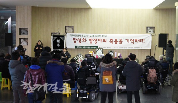 장애인 미신고 시설에서 시설 운영자의 방임과 학대 속에서 사망한 원주 귀래 사랑의집 사건 피해자 지적장애인 장성희, 장성아 씨의 장례식과 추모식이 23일 오후 서울 광화문 해치광장에서 열렸다. 특히 장성희 씨는 사망 12년 만에 차디찬 냉동고에서 나와 장례를 치르게 돼 주목을 끌었다.