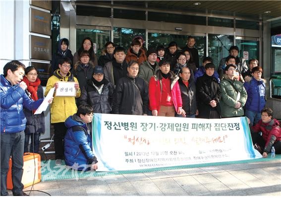 | ▲ 지난 12월 20일 오전 정신병원 장기·강제입원 피해자들은 서울 을지로 국가인권위원회 앞에서 기자회견을 열고 피해 상황이 발생했던 정신병원들에 대해 즉각적인 직권조사를 벌일 것과 정신보건법 폐지를 위한 정책 권고를 정부에 촉구할 것을 인권위에 집단 진정했다. | ||