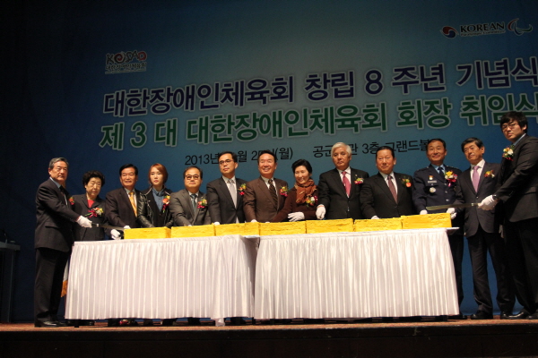 | ▲ 김성일 대한장애인체육회 신임회장 취임식에 참석한 내·외빈들이 축하 떡을 자르고 있다. | ||