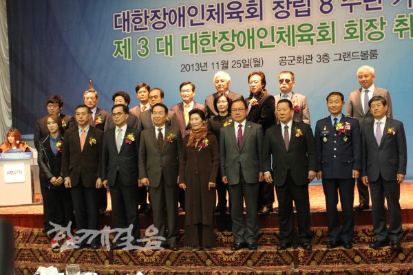 | ▲ 김성일 대한장애인체육회 신임회장 취임식에서 김성일 회장 내외(사진 앞줄 왼쪽에서 네번째, 다섯번째)를 비롯한 내·외빈들이 기념촬영을 하고 있다. | ||