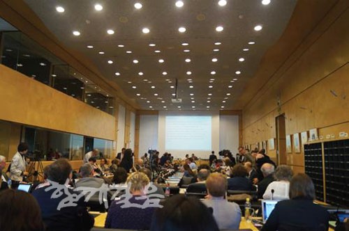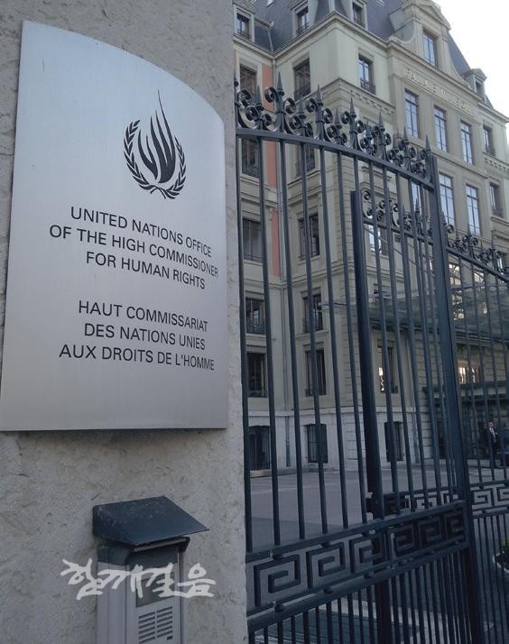 9월 2일 회의 장소는 제네바에 있는 유엔인권최고대표사무소(OHCHR: Office of the United Nations High Commissioner for Human Rights) 회의장인 빨레 윌송(Palais Wilson)이다. 이곳은 숙박장소에서 꼬르나방으로 버스를 타고 나와 다시 버스를 타고 도착해야 하는데, 휠체어 이용인이 있어 이동에 어려움이 있지 않을까란 걱정을 했다. 그런데 회의 기간 동안 이동에 아무 문제가 없었다. 오히려 어떤 제네바 시민은 휠체어가 이동할 수 있는 발판을 빼고, 제자리에 넣는 일을 우리 일행이 하는 것에 대해 운전사가 하도록 그냥 있으라는 조언까지 할 정도였다. 버스 중앙에 휠체어석이 마련돼 있고, 한 쪽 옆면이 푹신한 쿠션으로 덧댄 기둥이 있어 휠체어 이용인이 편하게 기대고 앉아 있을 수 있었다. 빨레 윌송은 고풍스런 높지 않은 건물이었다. 오래된 건물이라 화장실의 여닫이 방식을 그대로 살려 자동으로 열리고 닫혔고, 장애인용화장실은 남녀구분이 없었다. 회의실은 생각보다 그리 크지 않았다.
