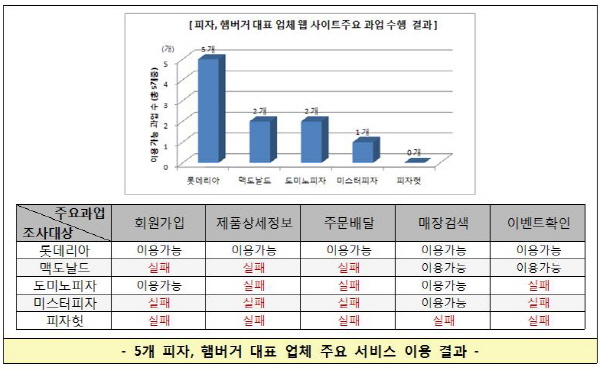 대표적인 피자, 햄버거 업체인 맥도날드, 도미노피자, 미스터피자, 피자헛 홈페이지의 주문배달 기능이 장애인 접근성을 제대로 준수하지 않아 시각장애인이 이용할 수 없는 것으로 조사됐다. 특히 피자헛은 회원가입, 제품 확인, 매장검색 등 조차 이용할 수 없었다.