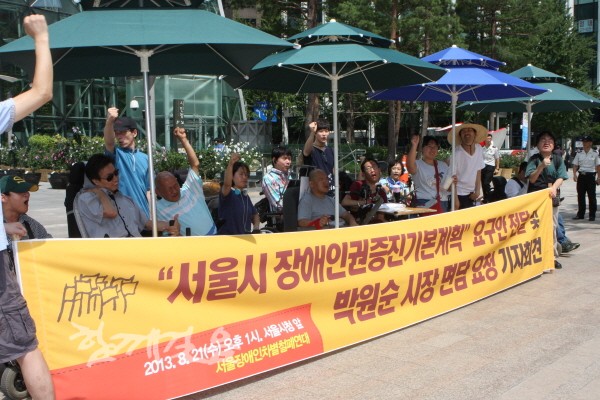 서울장애인차별철폐연대(이하 서울장차연)는 21일 오후 서울시청 앞에서 기자회견을 열고 요구사항 전달과 함께 박원순 서울시장 면담을 서울시에 요청했다.