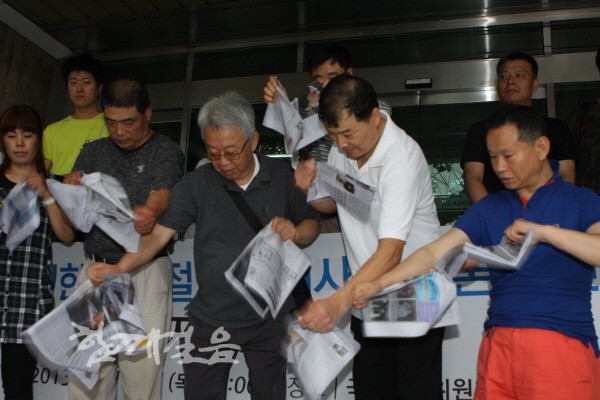 | ▲ 기자회견 참석자들이 장애인을 왜곡해 표현한 언론사의 신문을 찢는 퍼포먼스를 하고 있다. | ||