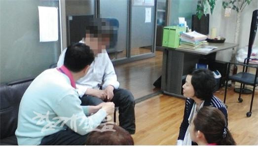 | ▲ 한 씨가 노원구청 사례관리자와 쉼터관계자 및 상담가들과 함께 향후 거주지 및 가해자 고소여부 등을 상의하고 있다. | ||