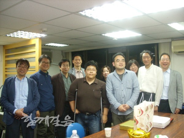 | ▲ 이번 대만 방문은 10월에 있을 아시아 장애인 국제교류대회 사전 답사 형식으로 진행됐다. 타이베이시내에 있는 빅토리재단 사무실에서 한일 대표단들이 빅토리 재단 창잉쑤 대표와 기념사진을 찍었다. 가운데 목발을 짚고 있는 사람이 창잉쑤 대표다. | ||