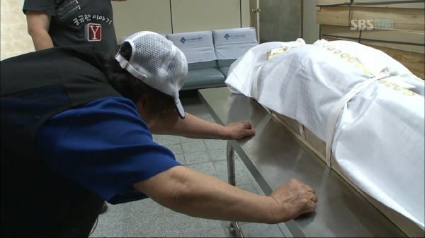 | ▲ 가난과 폭력 때문에 헤어진 후 32년 만에 만나게 된 故이광동 씨과 조아무개 씨 모자(母子). 장례도 치르지 못핸 채 12년 동안 병원 영안실 냉동고에 방치 됐던 아들의 시신 앞에서 조씨는 오열했다. (자료 사진: SBS 궁금한 이야기 Y 방송화면 갈무리) | ||