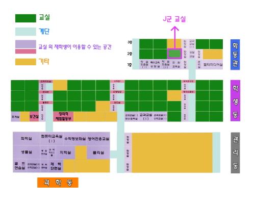 J군의 학급 교실은 위 그림1과 같이 화동관 2층에 위치해 있다. 이동수업은 보통 학생동과 과학동에서 실시하지만, 엘리베이터는 J군의 반이 있는 화동관 한 곳에만 설치돼 있을 뿐이다. 그렇기 때문에 이동수업을 위해 J군은 건물과 건물 사이에 연결된 계단을 건너가거나 건물을 빠져나와 밖에 설치된 계단으로 이동해야 한다. 또한, 편의시설만 잘 갖춰져 있다면 이동수업 외에도 J군이 타 재학생과 같이 이용할 수 있는 공간은 매우 많지만, J군은 바로 옆 건물로 이동하는 것도 어려운 실정이다.