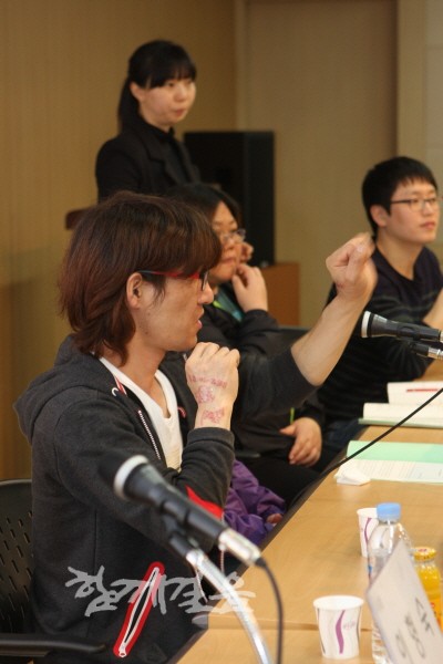 | ▲ 원주○○의집사건 피해 당사자 임지훈 씨가 증언대회에서 가해자 J씨로부터 당한 피해 사실들을 털어놓고 있다. | ||