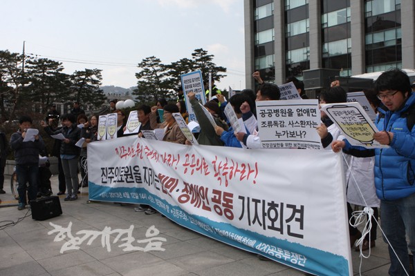 빈곤사회연대와 420장애인차별철폐 공동투쟁단은 12일 보건복지부 앞에서 ‘진주의료원을 지키는 빈민-장애인 공동 기자회견’을 열고 진주의료원 사태 해결과 공공의료 확충을 요구했다.