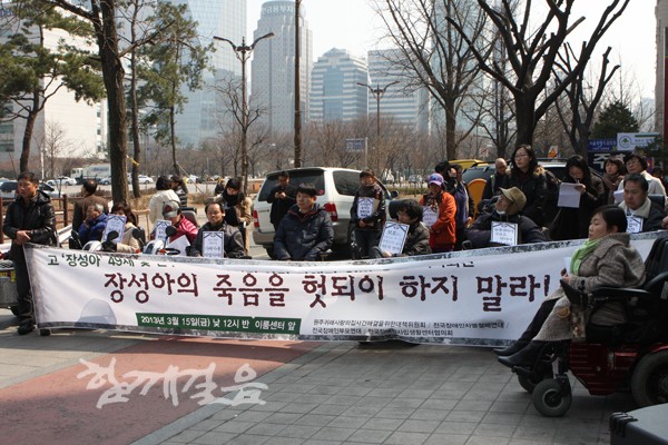 | ▲ 15일 원주귀래사랑의집사건해결을위한대책위원회(이하 원주대책위)는 여의도 이룸센터 앞에 모여 학대 속에 방치되어 제대로 치료받지 못하고 암으로 사망한 장성아 씨의 49재를 기념하고, 성아씨를 비롯한 수많은 장애인들을 학대해 온 가해자 장씨의 처벌을 촉구하는 기자회견을 가졌다. | ||