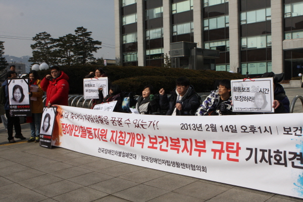 전국장애인차별철폐연대(이하 전장연)와 한국장애인자립생활센터협의회(이하 한자협)는 14일 오후 보건복지부 앞에서 기자회견을 열고 개정된 장애인활동지원 지침 규탄 및 긴급대책 마련을 촉구했다.