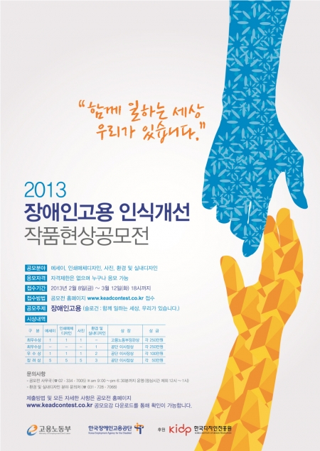 '함께 일하는 세상, 우리가 있습니다'라는 슬로건으로 개최되는 이번 공모전의 주제는 ‘장애인고용’이며, 오는 8일부터 3월 12일까지 에세이, 인쇄매체디자인, 사진, 환경 및 실내디자인 등 총 4개 부문의 작품을 접수한다.