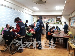 | ▲ 주간보호센터 '피망'에서 식사 중인 장애인들과 자원봉사자들 | ||