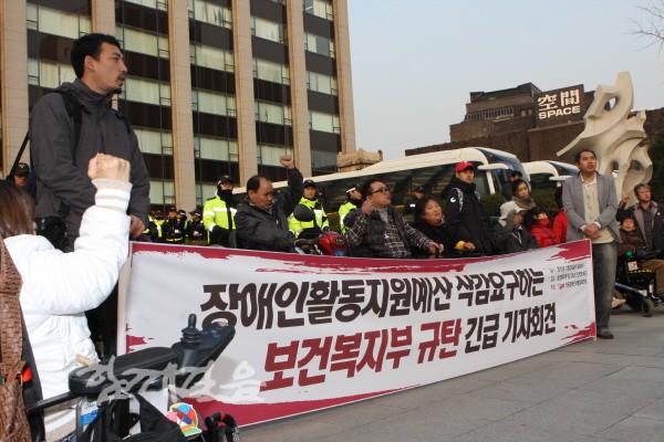 전장연은 복지위 다음날인 21일 복지부 청사 앞에서 긴급 기자회견을 열고 예산 증액에 반대하는 복지부를 규탄했다. 이날 기자회견에서 남병준 정책실장은 “장애인복지에 앞장서야 할 복지부가 24시간 활동보조 보장이 아니라 혼자 사는 최증증장애인의 집에 119를 부를 수 있는 비상벨을 달아주는 식으로 대책을 마련 중”이라며 “이미 작년, 재작년에도 복지부의 반대로 예산 증액이 물거품이 된 적이 있는데 이번만큼은 반드시 이 예산을 지켜야 한다”고 말했다.
