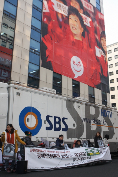 전장연 김정하 조직국장은 “가난한 사람들과 장애인들은 살기가 막막해서 죽어가고 있고, 박 후보는 준비된 대통령이라고, 약속을 지키는 대통령이 되겠다고 말하고 있다”며 “그러나 박 후보와 새누리당은 약속을 하지 않고 있다. 내년 활동지원 예산이 새누리당에 막혀 예결위에 머물러 있다. 박 후보와 새누리당은 분명히 답해야 한다. 다시는 장애인들이 가난과 부족한 활동보조시간 때문에 죽는 일이 없어야 한다”고 말했다.