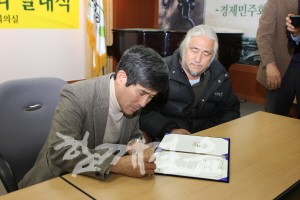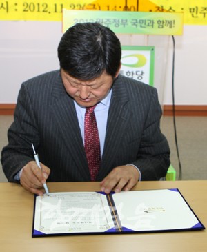 | ▲ 민주통합당 중앙선거대책위원회 매니페스토 본부 조재희 부본부장이 매니페스토 서약서에 서명하고 있다. | ||