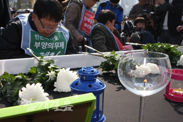 그는 이어 “장애인이 추운 겨울날 수도관이 터져서 얼어 죽더라도, 근육장애인이 밤에 혼자 자다가 호흡기가 떨어져 그것을 도와줄 활동보조인이 없어 죽어갔는데도, 가난한 노인이 거제시청에서 부양의무자 기준 때문에 자살해도 여전히 기다리라고 할 텐가”라며 “여전히 돈 없다고 하는, 예산이 문제라고 얘기하는 이 권력과 이 비정한 사회에 그들의 규칙에 따라서 우리는 비참하게 죽어가도 기다리라고 할 텐가”라고 소리쳤다.