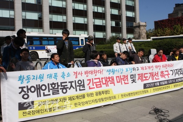 전국장애인차별철폐연대, 한국장애인자립생활센터협의회 등 5개 단체로 구성된 장애인활동지원 제도개선을 위한 공동투쟁단(이하 활동지원공투단)은 16일 오후 서울시 종로구 보건복지부 청사 앞에서 기자회견을 열고 장애인활동지원 긴급대책 마련과 중장기적 제도개선 대책 마련을 복지부에 촉구했다.