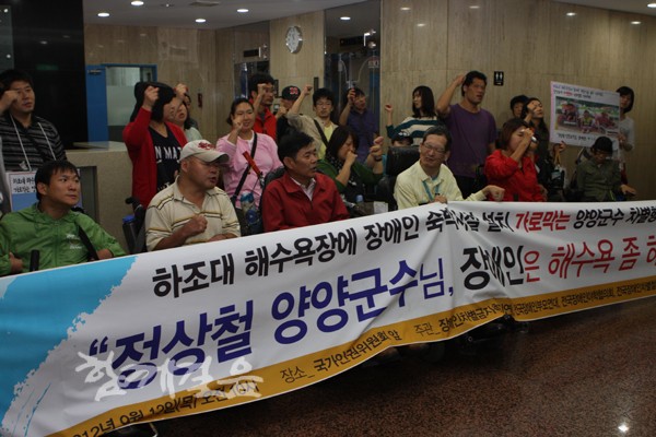 이날 기자회견에서 박경석 전국장애인차별철폐연대 상임공동대표는 “(하조대 희망들 건립을 위한) 예산이 다 잡히고 사업을 추진하는 과정에서 정상철 양양군수는 하조대 해수욕장에 상권을 가지고 있는 일부 토착 세력에 의해 법도 무시하고 최소한의 인권도 무시하면서 장애인들을 막고 있다”고 목소리를 높였다.