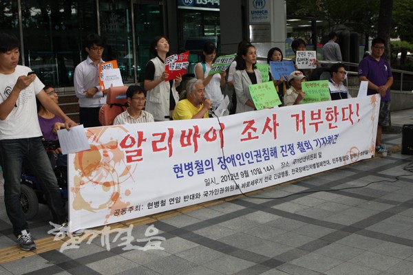 ‘현병철 인권위원장 연임반대와 국가인권위 바로세우기 전국 긴급행동(이하 현병철 반대 긴급행동)’은 10일 오후 인권위 앞에서 기자회견을 열고 “현병철 위원장의 연임으로 2010년 인권위의 장애인인권 유린 사건에 대한 조사가 제대로 되기 어렵다"며 "더구나 아직도 조사대상에 현 위원장이 포함돼 있지 않아 인권위를 더 이상 신뢰할 수 없으므로 진정을 철회한다”고 밝혔다.