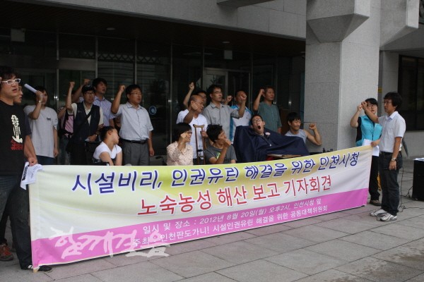 ‘인천판 도가니! 시설인권유린 해결을 위한 공동대책위원회(이하 인천도가니공대위)’는 20일 오후 인천시청 앞에서 기자회견을 열고 인천시가 약속한 예원·명심원에 대한 조치계획과 그동안의 경과보고, 앞으로의 활동계획 등을 발표했다.