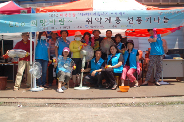 ‘Eco 희망바람 프로젝트’는 서울시복지재단이 리사이클 전문업체인 에코토리와 협약을 맺고 진행하는 취약계층 여름나기 지원 사업으로, 재단은 기업체나 서울시내 초·중·고등학교, 시민들로부터 중고 선풍기를 기증받아 깨끗하게 수리한 뒤 취약계층 서민들에게 나누어주고 있다.