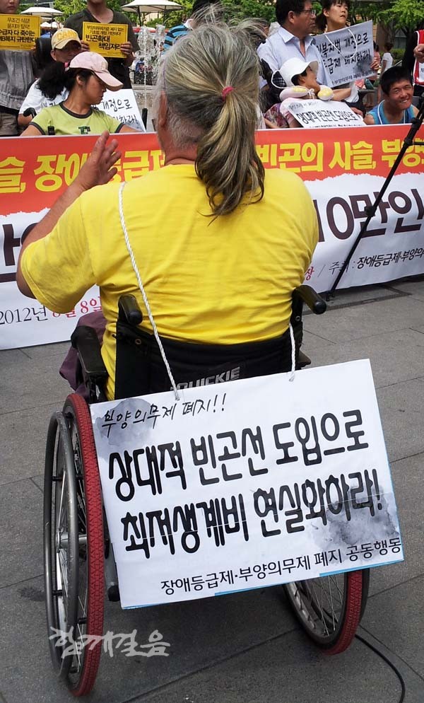 한국장애인자립생활센터협의회 이원교 회장은 장애인등급제와 부양의무제에 대해 “이 두 제도는 국민을 죽이고, 장애인들을 죽이는 악의적 제도다. 이러한 제도를 재정했을 당시 국민들에게 의견을 전혀 묻지 않았다. 사무실에 앉아 그들 마음대로 만들어낸 제도다”라고 비판했다.