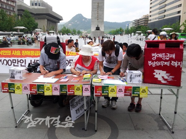 한편 기자회견을 마친 후 공동행동에 참여한 장애인들과 활동가들은 새누리당과 민주통합당 대선후보들, 그리고 19대 국회의원들에게 보내질 엽서에 장애등급제·부양의무제 폐지 등의 요구를 적는 행사를 가졌다.