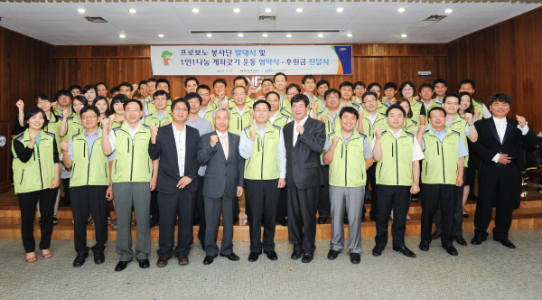 | ▲ 국민연금공단은 지난 17일 서울 송파 국민연금 본부회관에서 직원 60여명이 참여하는 ‘프로보노(재능기부) 봉사단’ 발대식과 사내 ‘1인1나눔 계좌갖기 운동’ 업무협약식을 갖고 장애아동에게 재활치료비 1천80만원을 전달했다 | ||