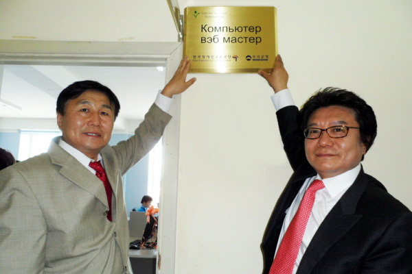 | ▲ 몽골 국립재활센터 직업훈련장비 기증식에 참석한 이성규 한국장애인고용공단 이사장(오른쪽)과 Janchiv Tamir 몽골 국립재활센터 원장(왼쪽)이 컴퓨터 실습실 현판식을 진행하고 있다. | ||