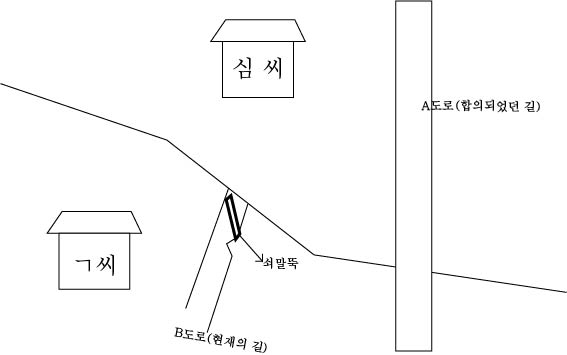 이 일로 심 씨와 ㄱ씨는 크고작은 다툼이 생겼고, 결국 화가 난 ㄱ씨는 합의를 철회하여 A길을 철거하도록 하고 현재의 B도로(그림참조)를 이용하도록 했다. 그러나 공로인 B도로에 1제곱미터도 되지 않는 삼각형 모양의 땅이 ㄱ씨 자신의 사유지로 포함되어 있음을 확인하자, 도로포장도 못하게 할뿐만 아니라, 쇠말뚝을 설치해 자동차가 다니지 못하게 했다.