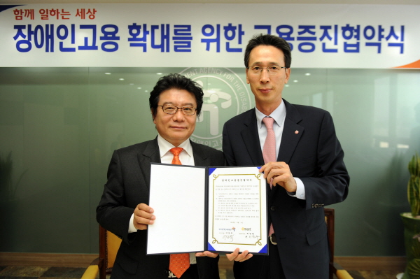 | ▲ 이성규 한국장애인고용공단 이사장(왼쪽)과 이갑수 이마트 고객지원본부장이 장애인고용증진협약서를 들고 있다. | ||