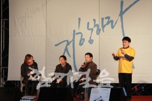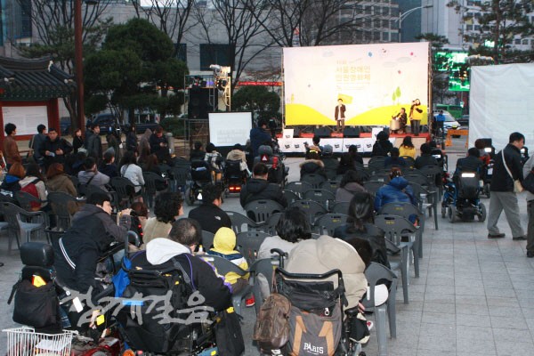 저녁 6시부터 시작된 영화제 개막식은 420장애인차별철폐공동투쟁단(이하 420공투단)이 노숙농성 중인 종각역 보신각광장에서 10주년 기념 야외개막으로 열렸다. 개막식 사회는 이음장애인자립생활센터 이규식 소장과 장애인차별금지추진연대 김찬희 활동가가 맡아 진행했다.