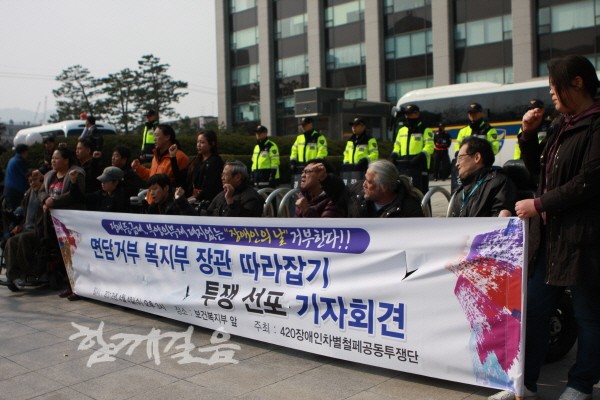 420장애인차별철폐공동투쟁단(이하 420공투단)은 4일 보건복지부 앞에서 기자회견을 열고 임채민 복지부 장관 면담을 촉구하고 나섰다.