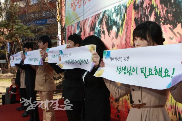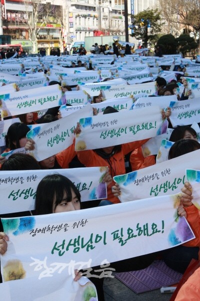 그는 이어 “총선을 앞두고 각 정당은 특수교사 법정정원 확보를 공약에 넣었다. 우리가 계속 감시하고 지키라고 요구해야 지켜진다”며 “교육은 사람과 사람이 만나야 하고, 그 만남은 사랑으로 이루어져야 하며, 제자가 참된 사랑을 할 수 있게 길러주는 것이다. 그 만남을 이루기 위해 이 자리에 모였다”고 목소리를 높였다.