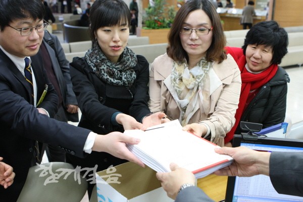 | ▲ 도가니소송지원변호인단이 서울중앙지방법원에 관련 소장을 제출하고 있다. | ||