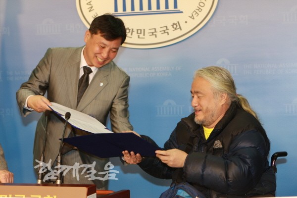 | ▲ 조준호 통합진보당 공동대표와 박경석 99%장애민중선거연대 공동대표가 정책협약서에 서명을 한 뒤 교환하고 있다. | ||