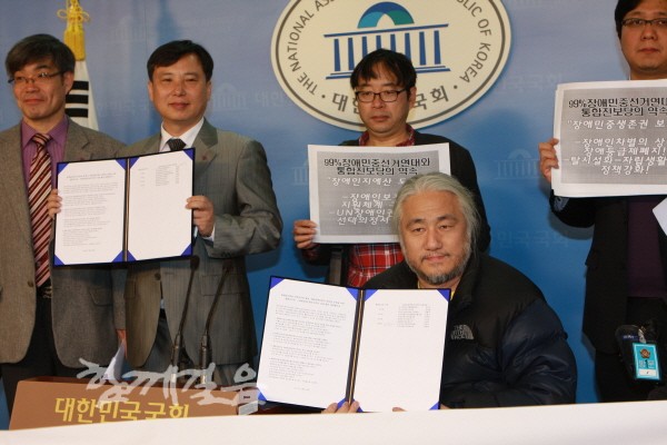 99%장애민중선거연대와 통합진보당은 29일 국회에서 정책협약식을 열고 99%장애민중의 생존권보장을 위한 협력 강화를 약속했다.