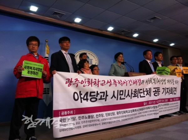 '광주인화학교 성폭력 사건 해결과 사회복지사업법 개정을 위한 도가니대책위원회(도나니대책위)'는 민주당, 만주노동당, 진보신당, 국민참여당 야4당과 함께 4일 오전 국회에서 기자회견을 열고 광주 인화학교 성폭력 사건 해결과 법·제도적 지원방안 마련, 사회복지사업법 개정을 위해 적극 나설 것이라고 밝혔다.