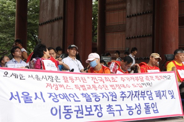 서울장애인차별철폐연대는 11일 오후 덕수궁 대한문 앞에서 기자회견을 열고 장애인 활동지원 추가자부담 폐지와 이동권 보장을 서울시에 촉구했다.